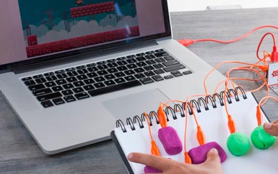 Makey-Makey es un kit ideal para llevar a cabo tus inventos. Funciona conectado a una computadora y tu placa se convierte en un teclado o en un mouse. Tiene un procesador y se conecta mediante cable USB (incluido). No necesitas plataforma de programación para trabajar con Makey Makey pero puedes desarrollar también proyectos con Scratch.